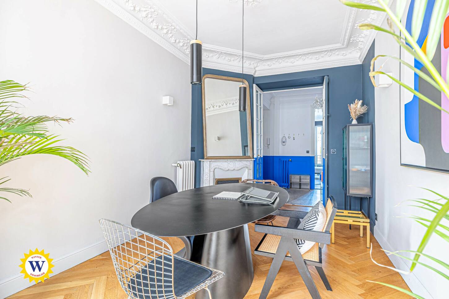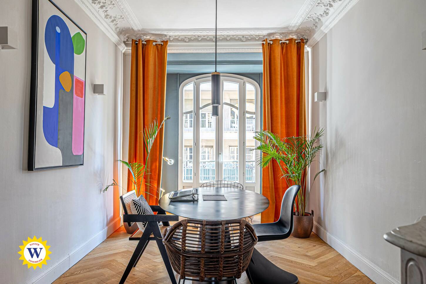 Au sein d’un bel immeuble niçois de caractère, ce bien rare séduit immédiatement par le charme préservé de l’ancien : parquet en chevron, moulures d’époque, belle hauteur sous plafond, volumes généreux et luminosité remarquable. L’ensemble a été sublimé par une décoration contemporaine raffinée et un mobilier soigneusement sélectionné, offrant un équilibre parfait entre élégance et confort.
