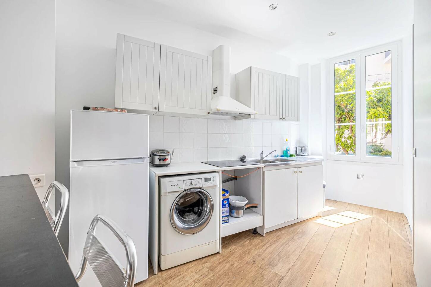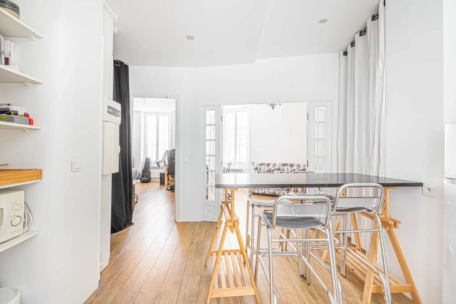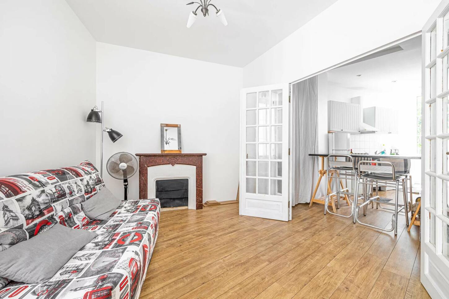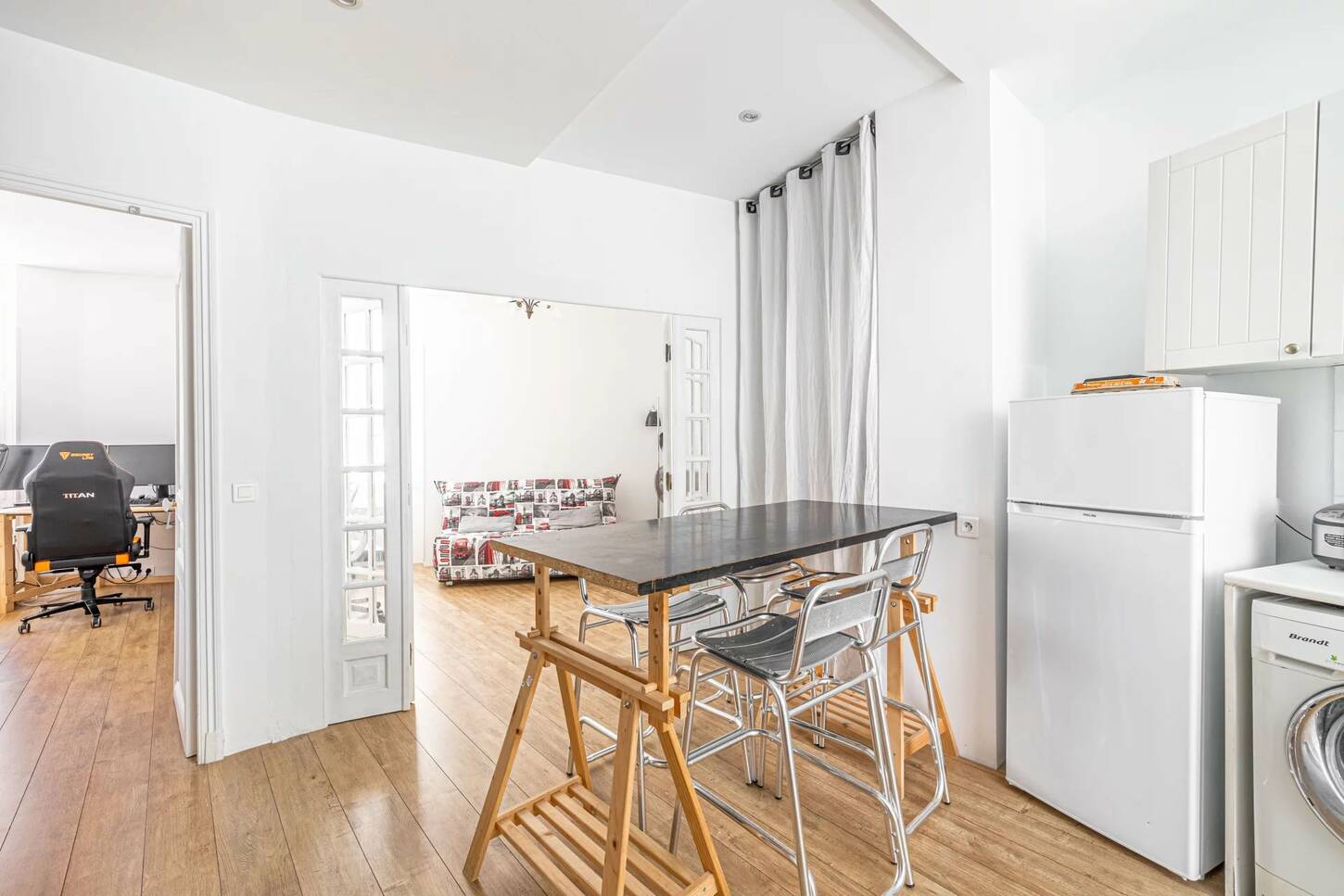 Cet appartement se compose d'une entrée, d'une cuisine américaine aménagée et équipée (plaque, micro onde, réfrigérateur, machine à laver), d'un séjour lumineux avec cheminée, une chambre avec bureau et une salle de douche avec un WC.