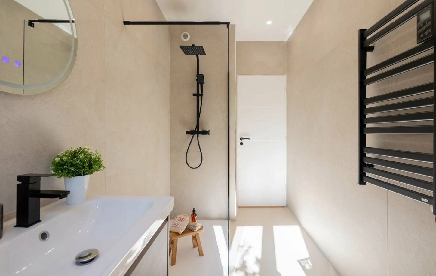 Une belle salle de douche contemporaine avec WC vient compléter cet ensemble harmonieux.