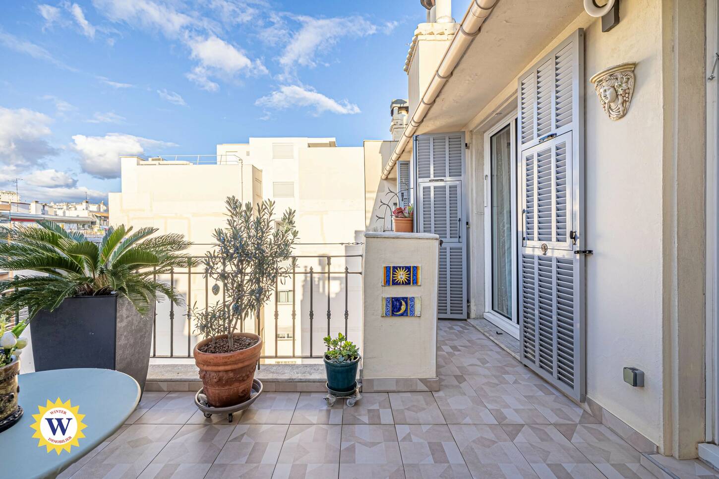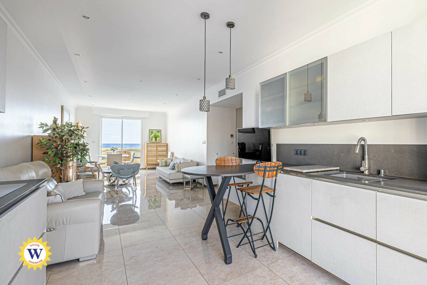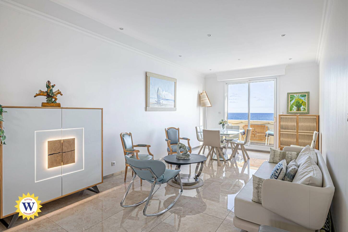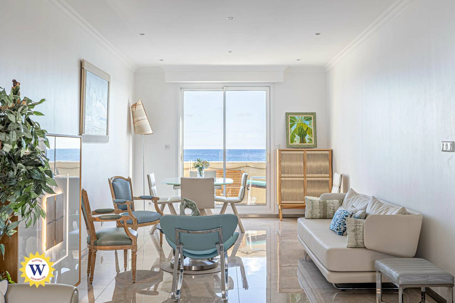 Le séjour se prolonge sur un balcon face à la mer, offrant une vue imprenable sur la Baie des Anges.