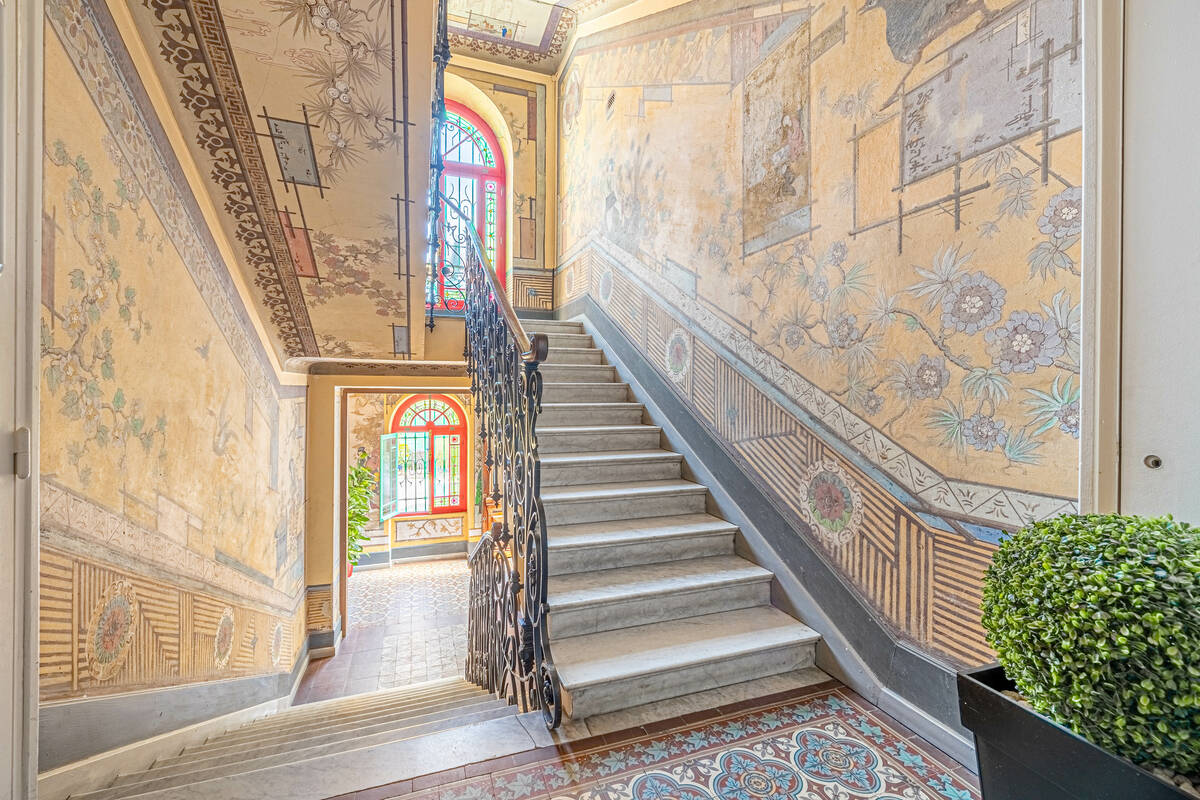 Une élégante demeure Belle Époque au 8 rue Caffarelli, où façades de pierre sculptée et frises sgraffitées côtoient un vestibule et un escalier tournant ornés de peintures japonisantes rares à Nice.
