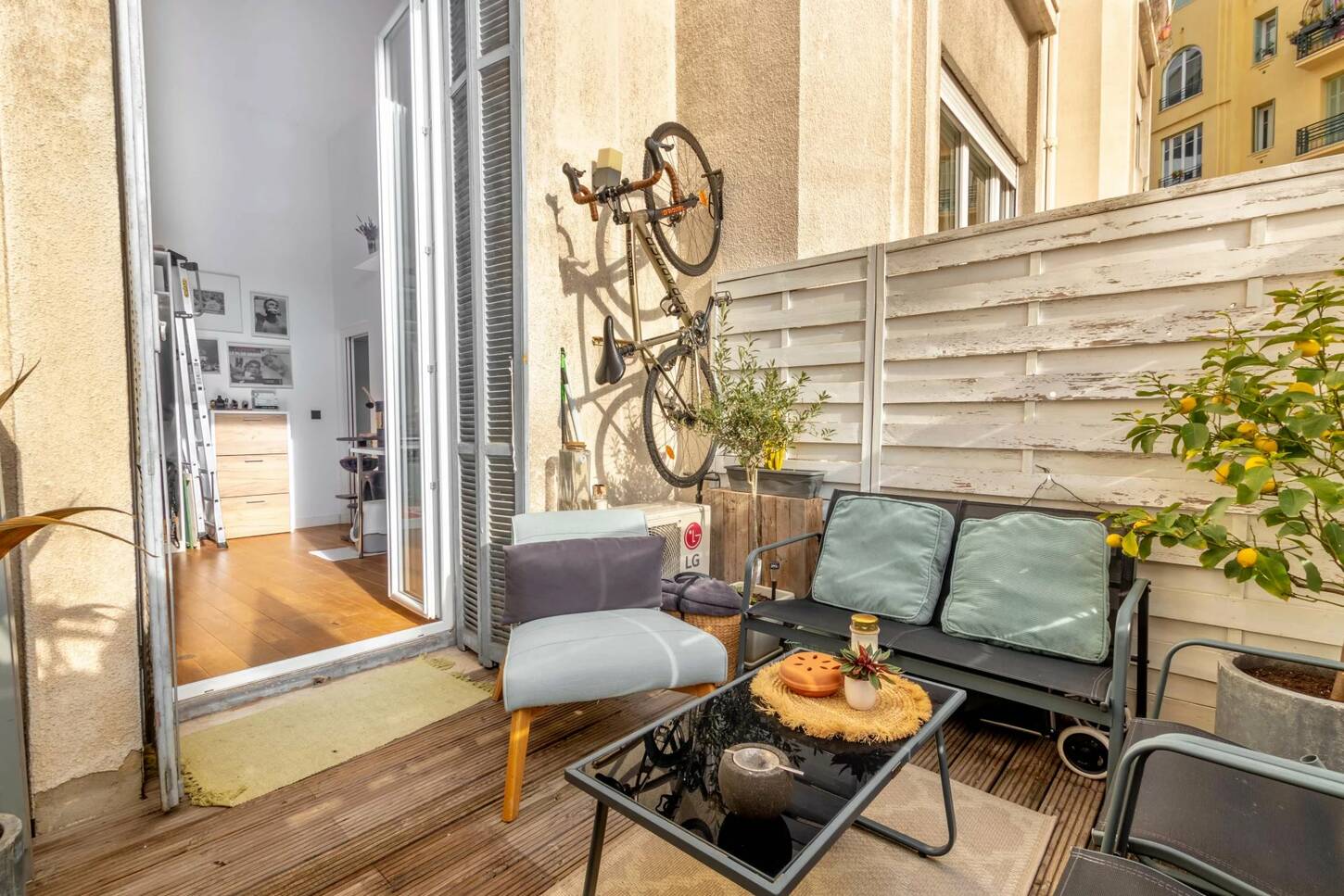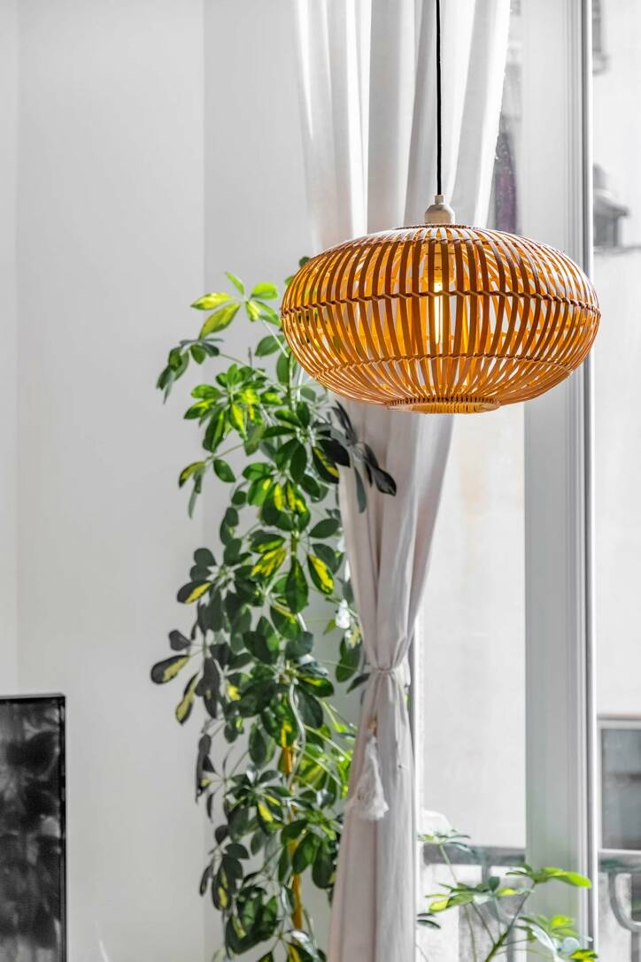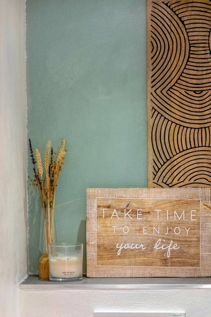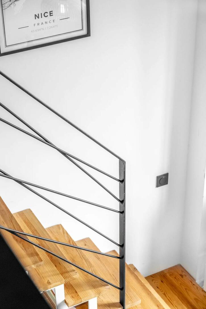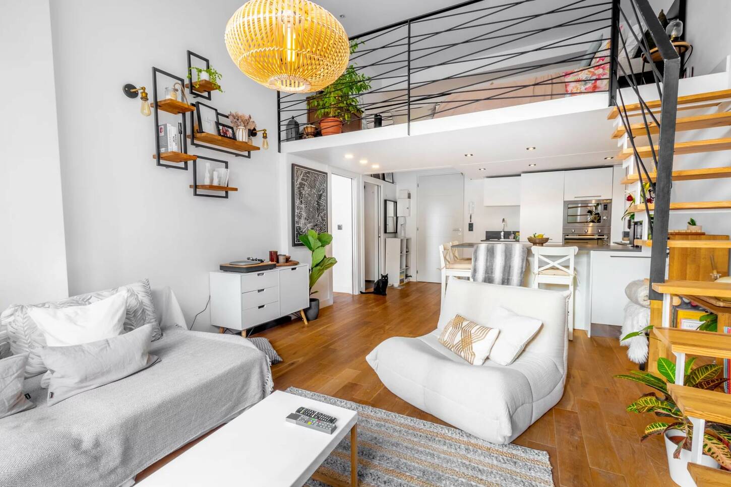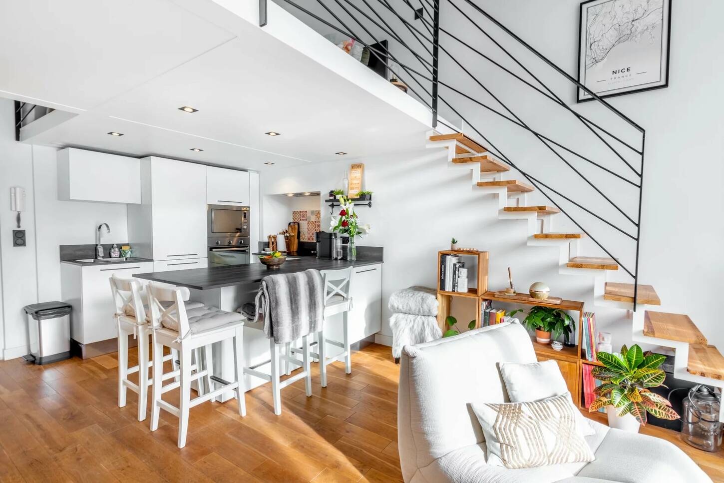 Площадью 50 м2 и террасой 10 м2, состоит из прихожей, большой гостиной с оборудованной кухней открытого плана и мезонином, служащим второй спальней, спальни, превращенной в кабинет и гардеробную, а также душевой комнаты с туалетом.