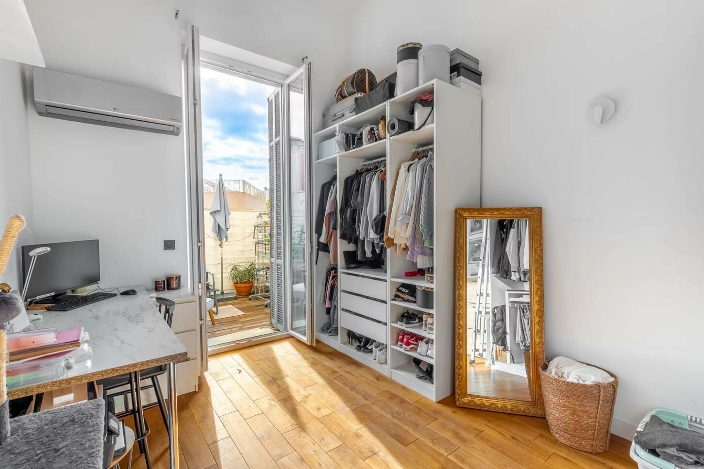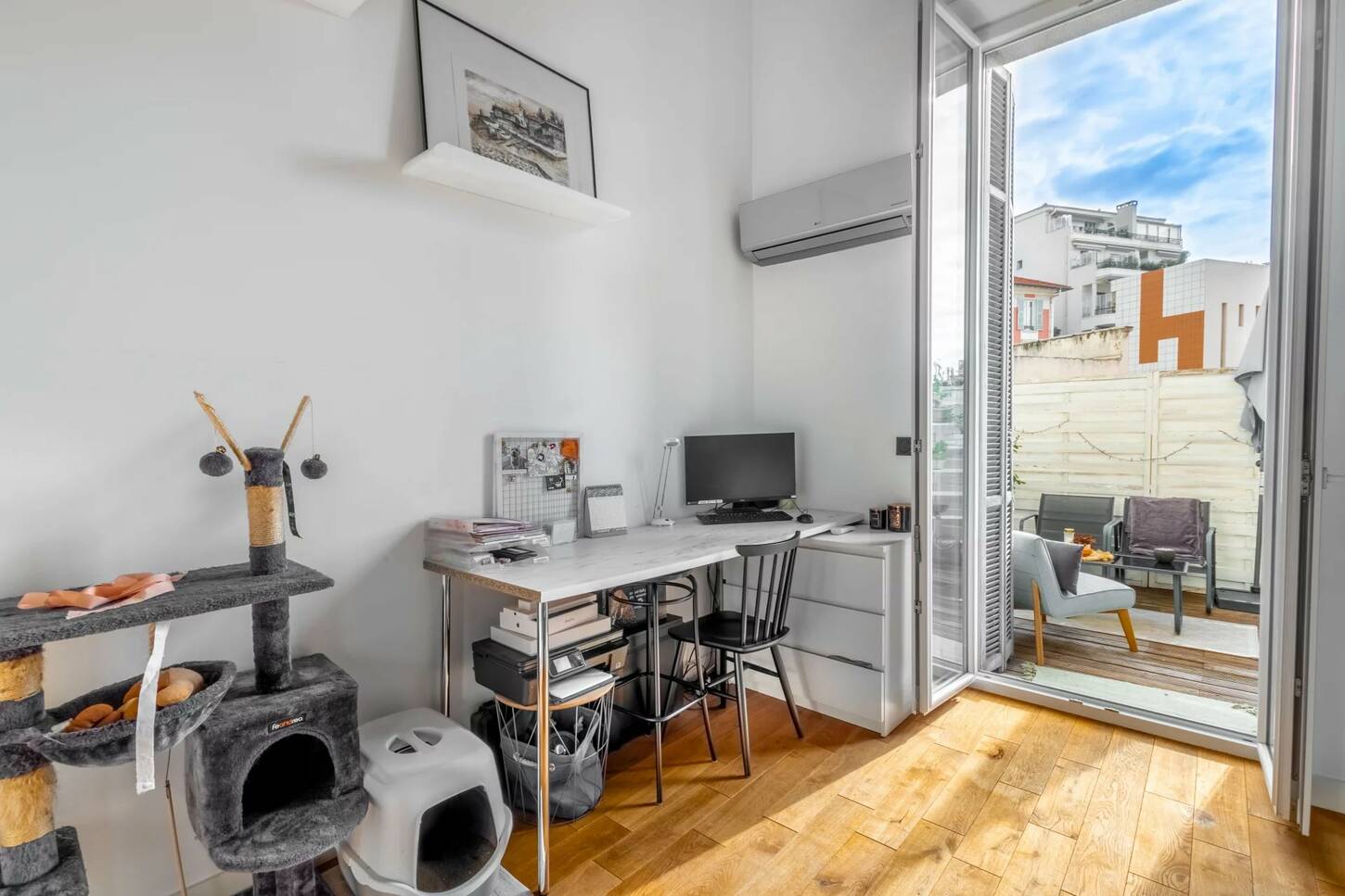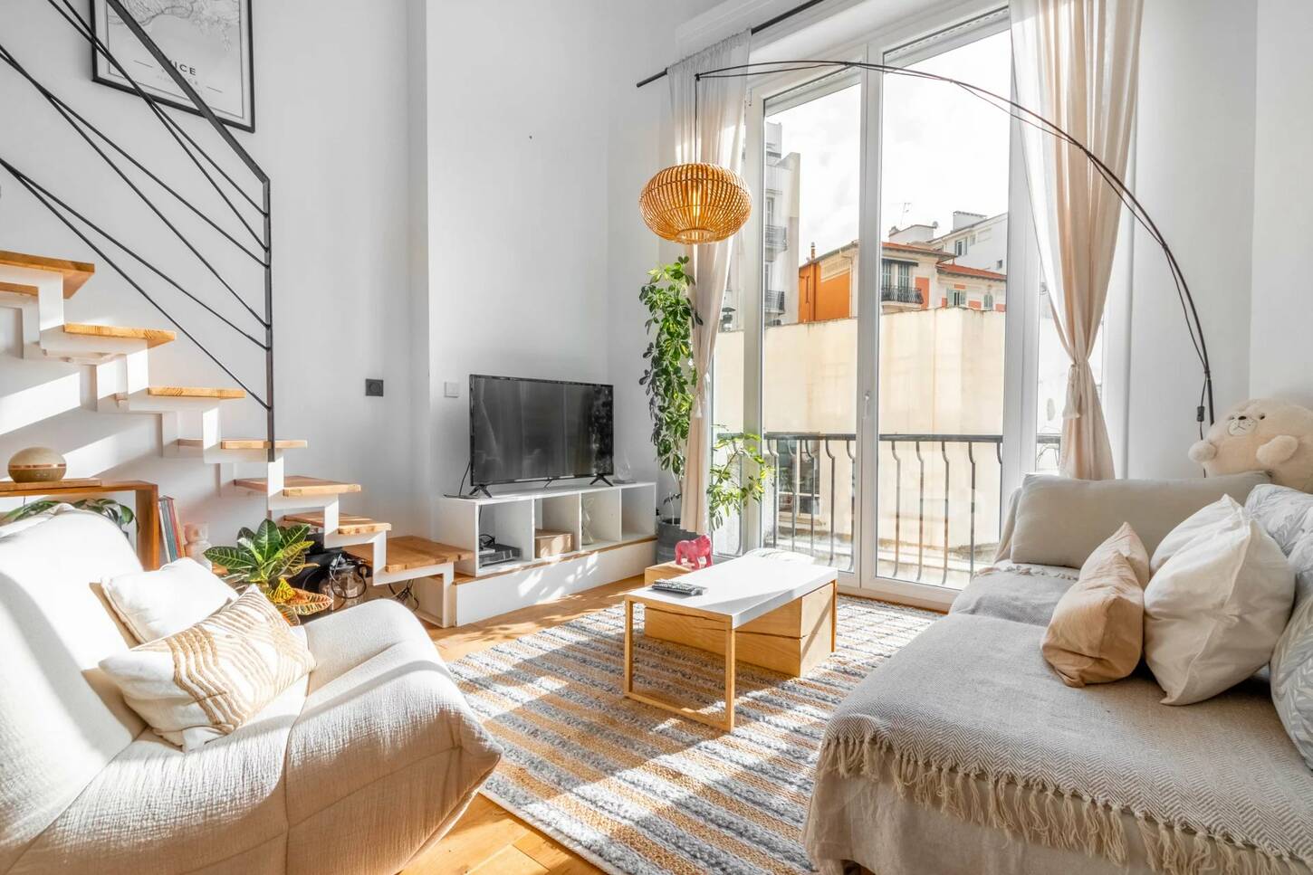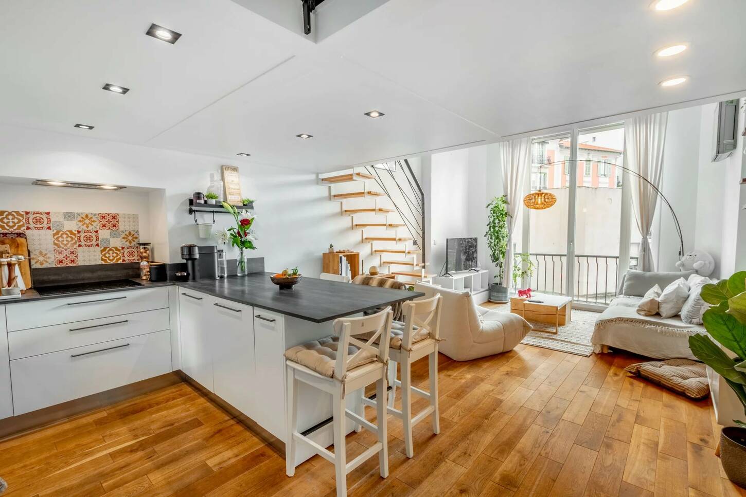 Эта квартира находится в отличном состоянии, недавно отремонтирована и очень светлая благодаря южной экспозиции, большим открытым пространствам и высоте потолков 4м.